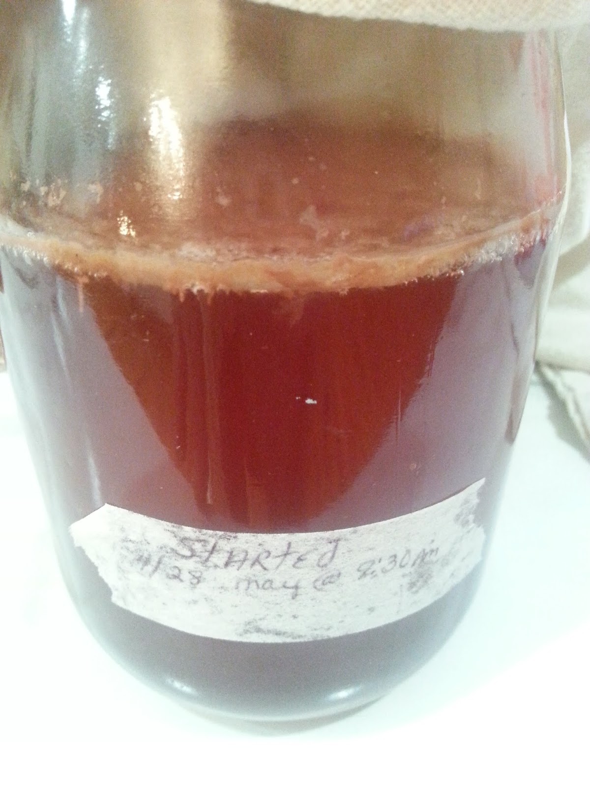 I started by sterilizing my quart jar in boiling water and setting it aside to cool. In a pot, I placed 4 tea bags (3 green tea, and 1 black), and 2 cups water. You can not use tap water if your have city water since it is chlorinated and this will kill the good bacteria. I have well water without added chlorine etc so I used my tap. Otherwise use bottle water. I bring this to a boil then turn it off. i added 1/3 cup sugar and stirred then let it steep for couple of hours. I also understand you can NOT use decaffinated tea. The scoby uses the caffiene and sugar to grow. so that in the end of the process there is very little if any of the two remaining in your finished kombucha. After steeping I removed the tea bags and let the tea finish cooling. It has to cool completely before adding your store bought kombucha. The heat will kill the good bacteria. I poured out all but the last 1/4th or so of two bottles of kombucha leaving the stringy stuff in the bottom. I have read where others use one bottle, but I had it so i used two. Do not drink the excess out of the bottles, pour them in a drinking glass. You dont want to contaminate your tea from bacteria from your mouth. Pour the remainder of the kombucha that you saved into your quart jar with your tea. Cover this with a towel and rubber band to hold it on. Depending on how warm your house it, it may take 2 weeks or more to grow your scoby. i left mine two weeks. I probably should have left it another week however, cause my scoby was a little thin. I am inpatient so I hope its thick enough. I read it should be 1/4" thick. Mine was about 1/2 that.